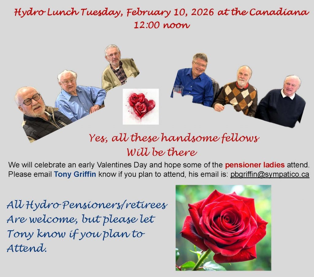 Nazma Premji, Julia Lindsay ,Bruno Bellissimo and Gillian Salter encourage you to join so that you may enjoy social outings with fellow retirees from our extended Hydro family. Pensioners of one of Ontario Hydro’s successor companies OPG, Hydro One, IESO, and ESA are able to join. Additionally, partners or guests of an eligible pensioner are also able to join. Membership information and Forms may be found under “How to Join“